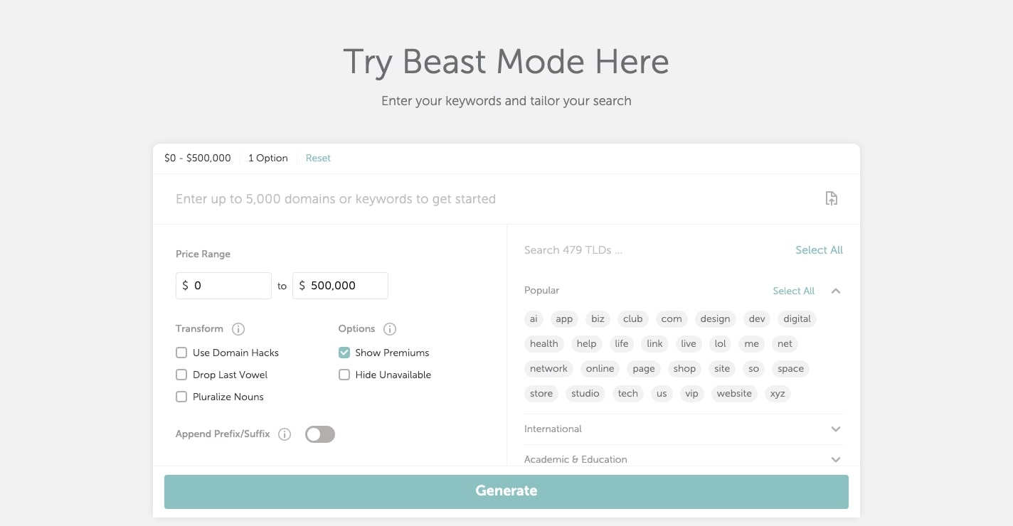 Modul Beast îți oferă tot ce ți-ai putea dori vreodată de la o căutare de nume de domeniu. Introduceți câteva cuvinte cheie. Alegeți un interval de preț. Selectați Opțiuni de transformare pentru a crea variante. Și la final, vă alegeți extensiile de domeniu de nivel superior pe care doriți să le vedeți. Opțiunile de domeniu de nivel superior merg și mai departe. Acestea vă permit să alegeți extensii de domeniu în funcție de categoriile de industrie în care activați. Spre exemplu, domeniul tehnologic, publicitar sau de producție. Obțineți mult control în modelarea rezultatelor căutării dumneavoastre. Namecheap pare să funcționeze mai bine atunci când introduceți nume de domenii complete.Este de reținut faptul că, acest motor de căutare favorizează numele complete in detrimentul cuvintelor cheie.