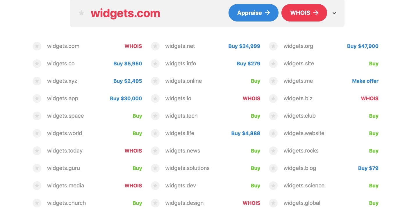 Instrumentul lor nu vă oferă variații – în schimb, vă arată disponibilitatea într-un număr de extensii diferite. Acest lucru funcționează bine dacă aveți deja câteva nume de domenii în minte.