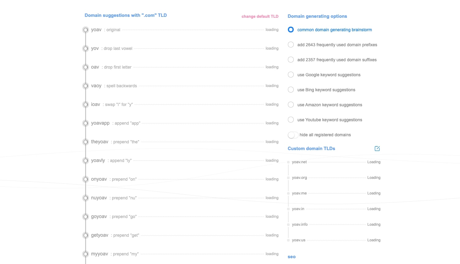 O altă caracteristică excelentă este posibilitatea de a utiliza cuvinte cheie generate de motorul de căutare pentru a găsi nume. Google, Bing, YouTube, Amazon și alți generatori de cuvinte cheie specifice platformei vă oferă și mai multe nume de domenii disponibile.