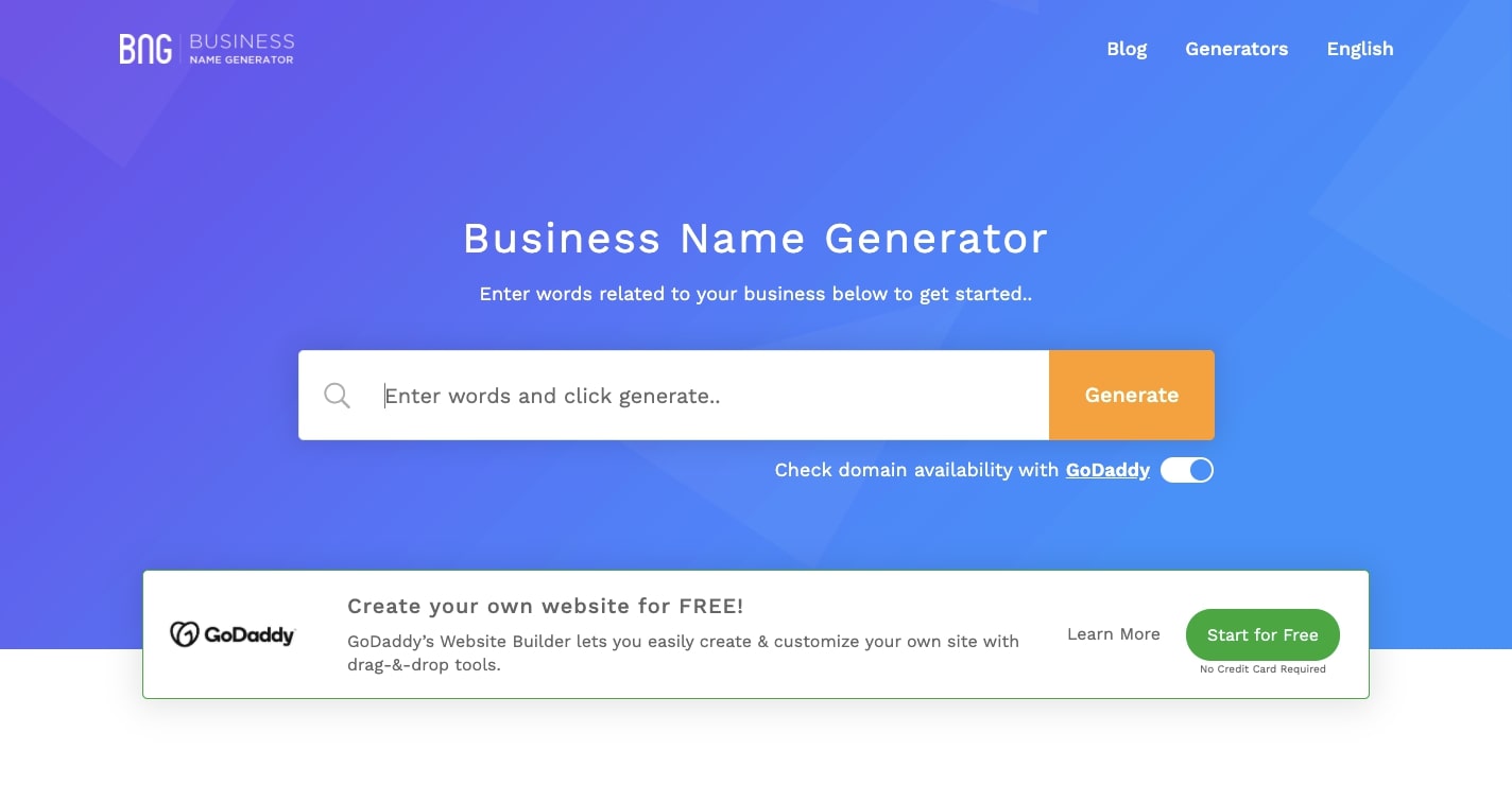 Introduceți câteva cuvinte cheie și Business Name Generator va servi ca generator de nume de companie și vă va arăta domeniile asociate care nu au fost preluate.