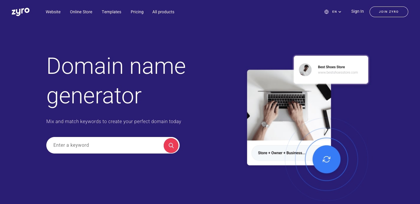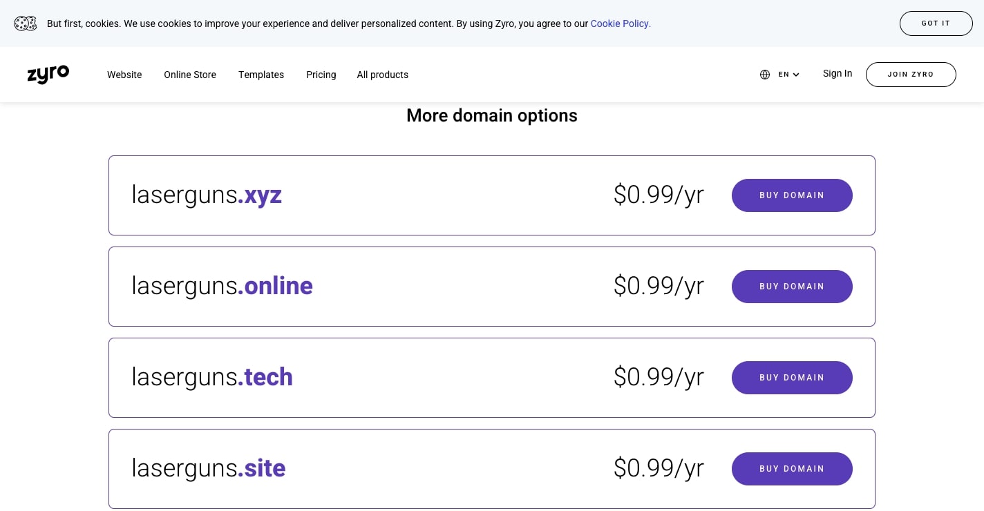 Zyro începe cu o bară de căutare. Aici introduceți cuvintele cheie, apăsați butonul, apoi obțineți o pagină cu nume de domenii disponibile. Alegeți-l pe cel pe care îl doriți, apoi Zyro vă ghidează prin pașii pentru a-l înregistra. Zyro se remarcă printr-o experiență simplificată a utilizatorului.