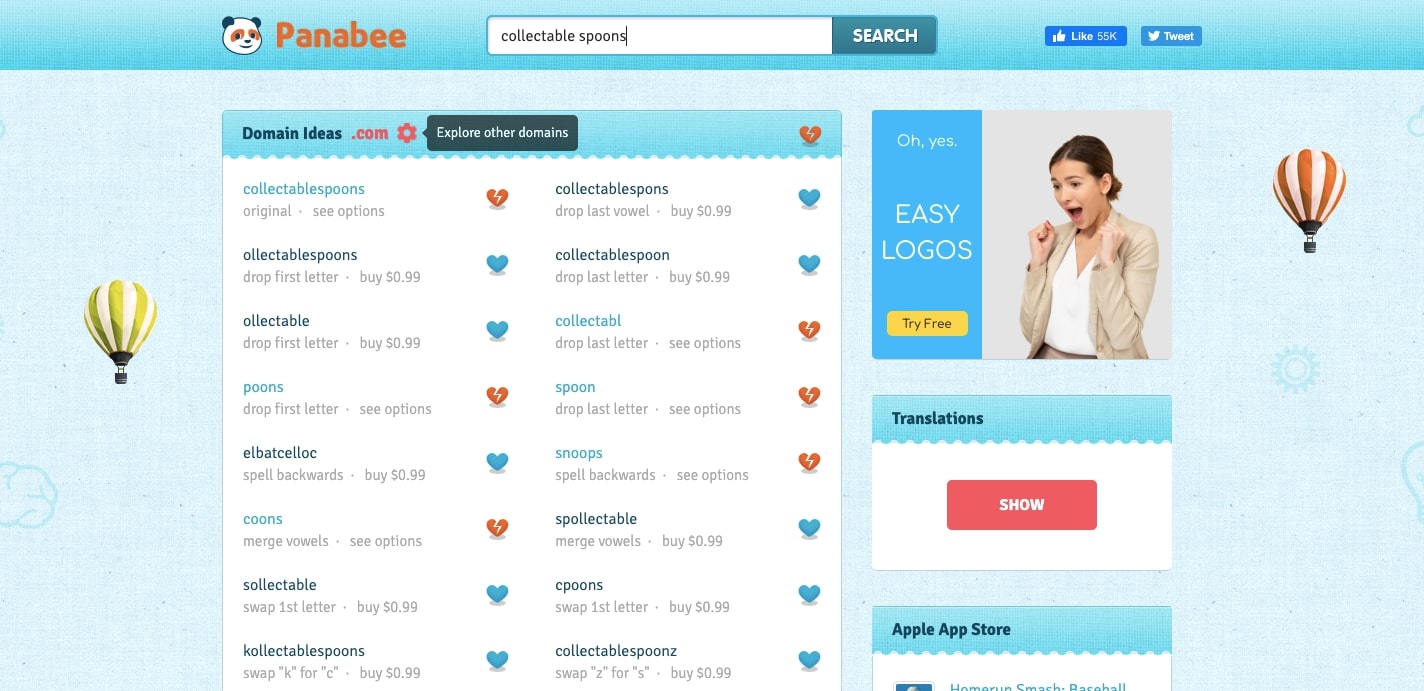 Vi se solicită să introduceți câteva cuvinte cheie în caseta lor de căutare. În loc de o derulare lungă de rezultate obositoare, fiecare nume de domeniu disponibil primește o inimă albastră lângă el, cu o inimă frântă lângă domeniile preluate. Este un generator eficient de nume de domeniu. Grafica și stilizarea fac din acesta o experiență de utilizator distractivă și captivantă.