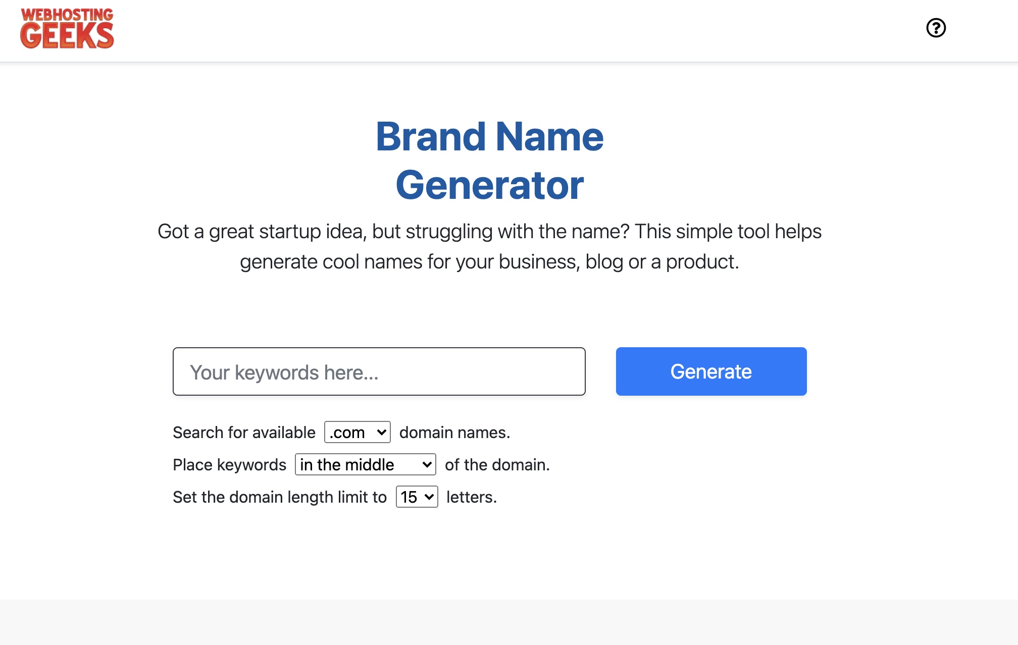 Generatorul de nume de marcă de la Webhosting Geek este un generator simplu și direct. Acestea vă permit să personalizați lungimea numelui de domeniu dorit și plasarea cuvintelor cheie dorite. Site-ul are câteva sfaturi perspicace despre branding, care vă vor ajuta să alegeți numele potrivit pentru afacerea dumneavoastră.