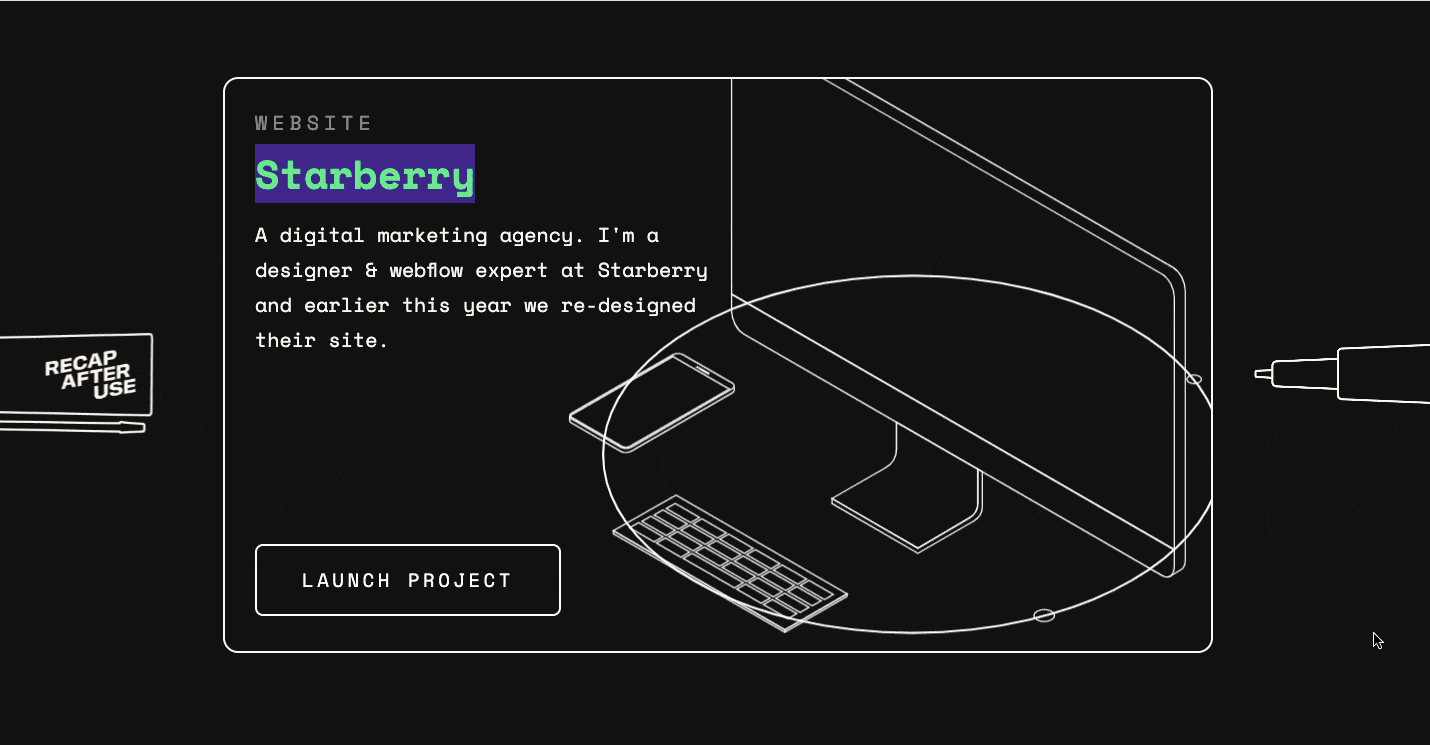 Există efecte de paralax pentru fiecare proiect prezentat. Trecerea cu mouse-ul peste un proiect completează conturul cu detalii și schimbă imaginea, oferind un sentiment de tridimensionalitate. Când imaginile din prim-plan se mișcă pe o culoare de fundal solidă, acestea le fac mai proeminente decât atunci când sunt lăsate statice.