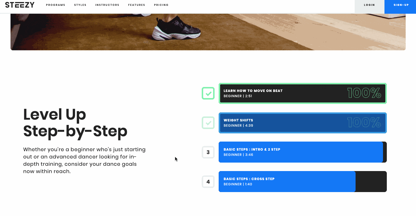 STEEZY Studio dorește ca tu să faci exerciții zilnice prin exercitarea unor mișcări. Oferă cursuri video pentru dans, care sunt mai mult decât o simplă redare a unui videoclip. Vă permit să alegeți diferite unghiuri, mișcări în buclă și opțiuni pentru a studia dansurile în profunzime.