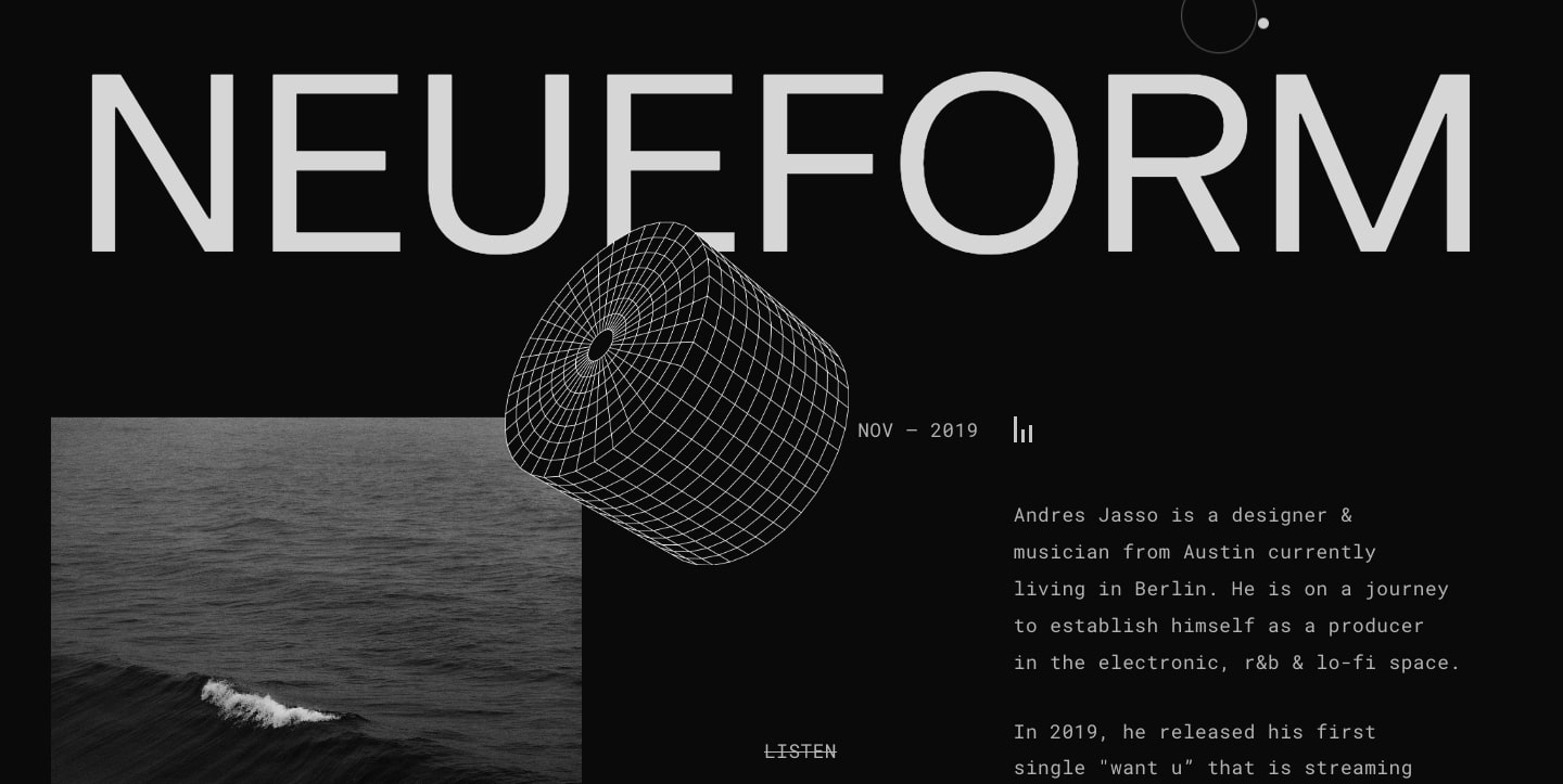 Neueform este spațiul web al muzicii electronice lo-fi, hipnotice, inspirate de R&B a lui Andres Jasso. Nu numai că are abilități de producător, dar este și designer – și se vede. El a creat un design de site web cu muzică alb-negru minimal, aproape brutalist, pentru a-și prezenta melodiile. Există un efect de paralax atrăgătoar în partea de sus, care atinge o rețea cilindrică. Este un efect mic, dar face ca această formă să sară de pe ecran. Acesta este un alt exemplu conform căruia efectele de paralax nu trebuie exagerate, dar chiar și mișcările mici pot adăuga atât de mult unui design.