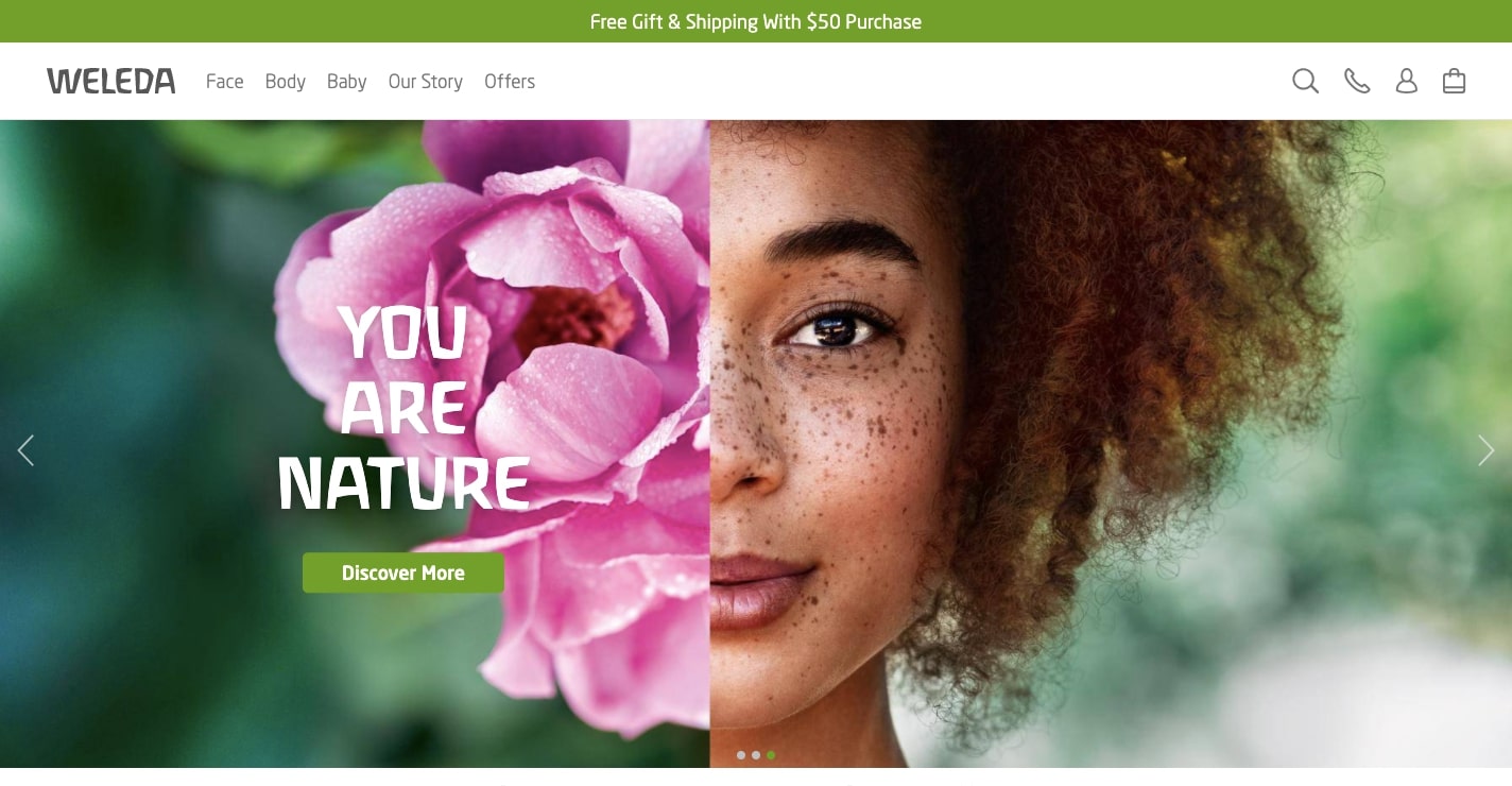 Pagina de destinație a companiei de îngrijire organică a pielii Weleda surprinde esența mărcii lor. Site-ul lor exemplifică exact cine sunt, cu nuanțele de verde care se leagă de ingredientele naturale pe care le folosesc. Imaginea erou care reflectă dualitatea frumuseții naturale caracteristică mărcii.