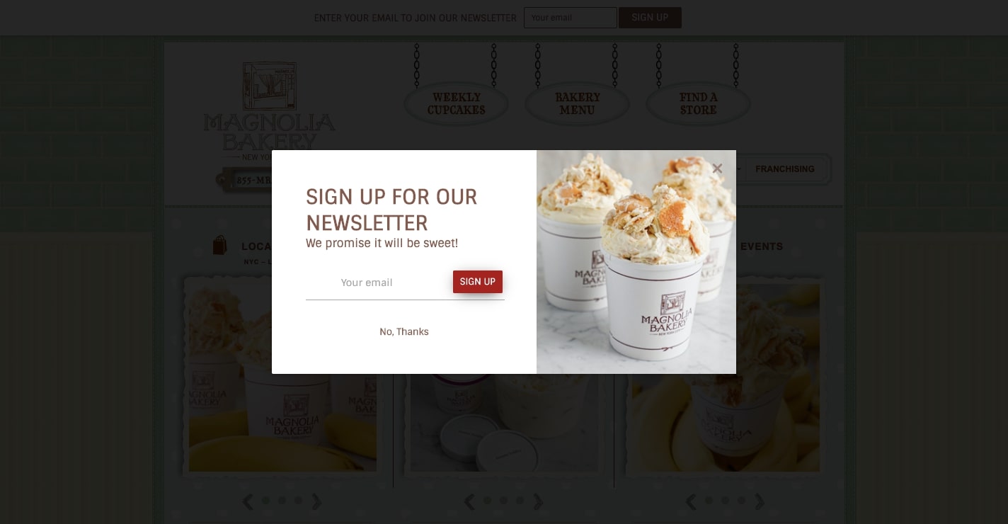 Magnolia Bakery, renumită pentru prăjituri și alte delicii dulci delicioase, pune o înscriere la newsletter în partea de sus a designului lor și prezintă acest formular de înscriere pop-up atunci când un vizitator ajunge pentru prima dată pe pagina sa de pornire.