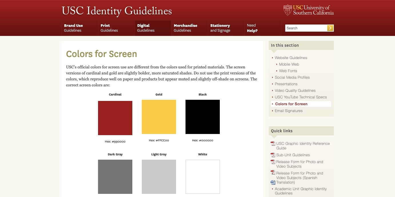 Acest lucru este vital pentru orice afacere sau organizație. Fie că este vorba de Coca-Cola sau chiar de un institut de învățământ, un brand are nevoie de linii directoare clare cu privire la tipul de culori care vor fi folosite. Mai jos sunt liniile directoare ale mărcii USC, care arată culorile pe care toți designerii trebuie să le respecte în crearea unui site.